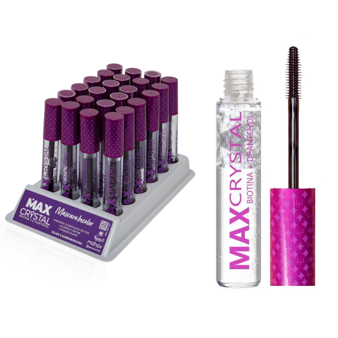 Descrição: Máscara incolor para cílios e sobrancelhas. Conheça a Max Crystal. Um produto que está super em alta e todo mundo ama usar. Modela e define os fios; Intensifica o volume com efeito natural; Mantém as sobrancelhas no formato desejado, sem perder a naturalidade; Deixa os cílios estruturados e realçados.
