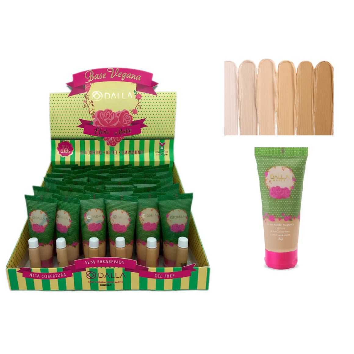 Descrição: A Base Matte Vegana da Dalla foi desenvolvida especialmente para atender a pele das brasileiras, ela contém cobertura excepcional e longa resistência na pele. Com ela você pode construir camadas bem estruturadas, caso queira maior cobertura para a sua pele, mas também pode produzir uma cobertura de efeito mais natural, como você preferir e sem prejudicar seu acabamento final.